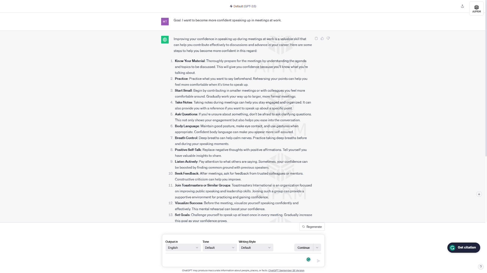 - ChatGPT provided a longer, more comprehensive response with 15 specific tips for building confidence speaking up in meetings. It included actionable strategies like preparing material, visualizing success, joining Toastmasters, and more.