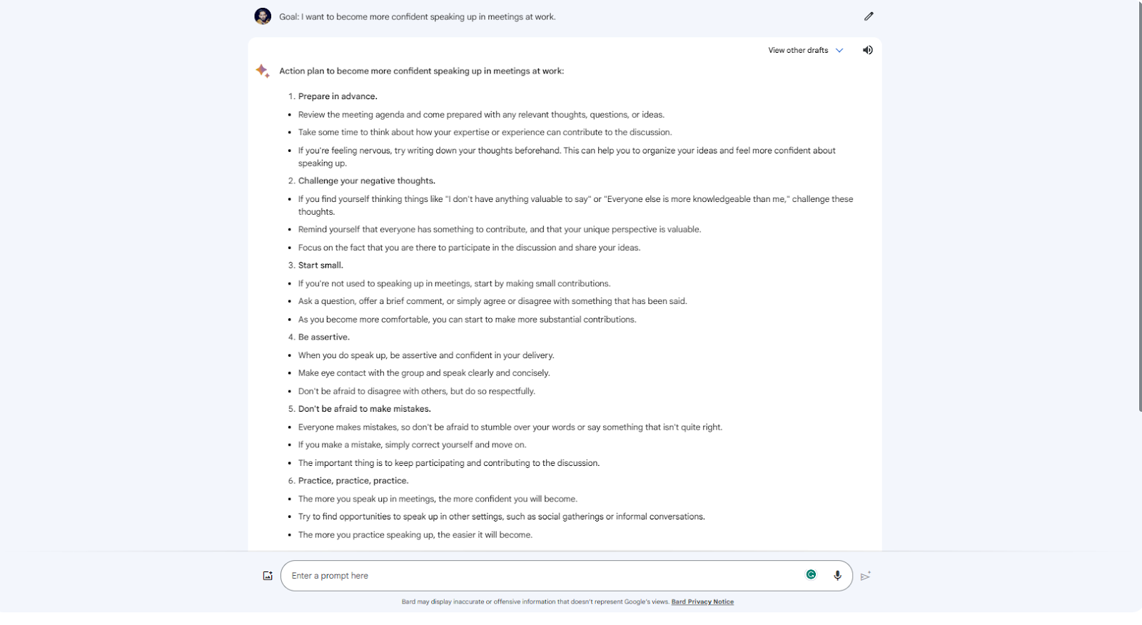 - Google Bard offered a shorter 6-step action plan, focused on starting small, challenging negative thoughts, being assertive, and practicing regularly.